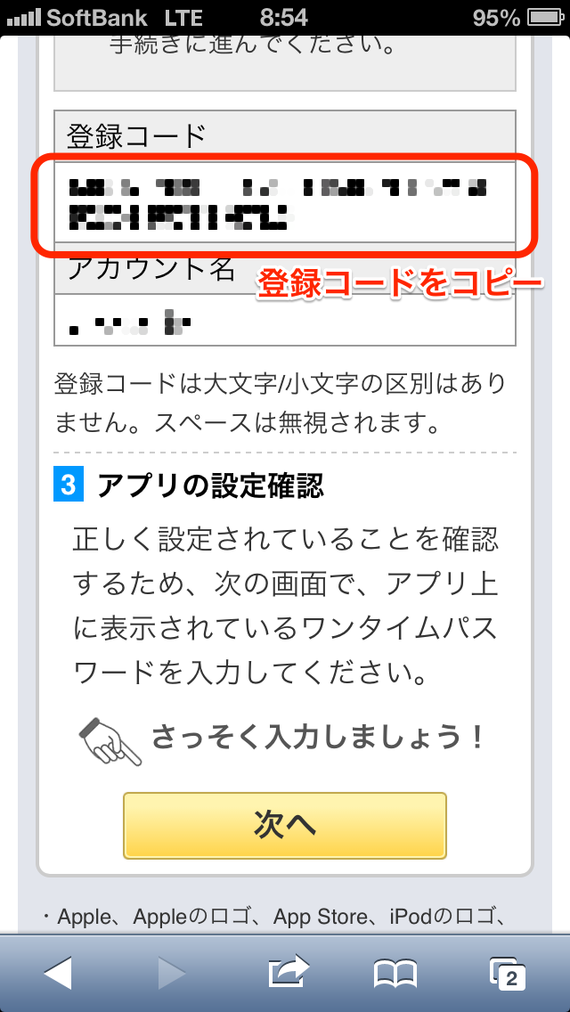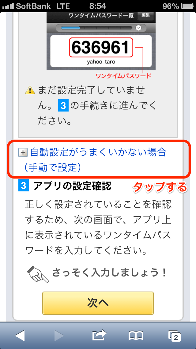 なんの下調べもせずに、Yahoo!JAPANのワンタイムパスワード設定画面の「自動設定がうまくいかない場合(手動で設定)」のリンクを押し、表示された登録コードをGoogle Authenticatorに設定してみた。