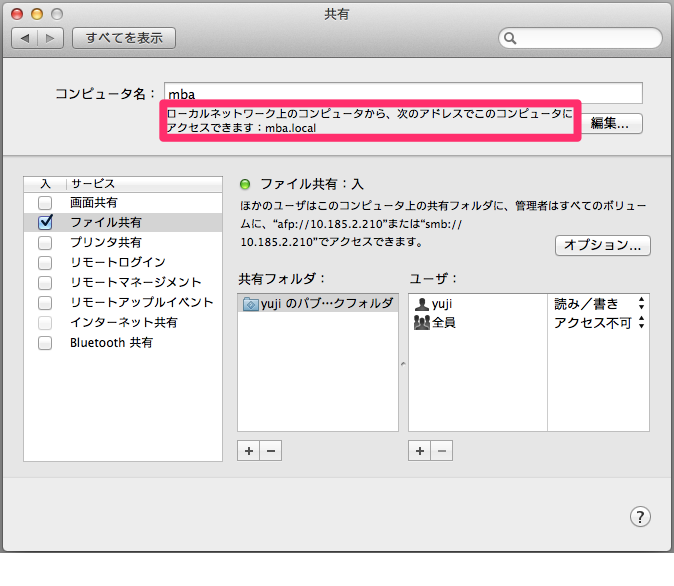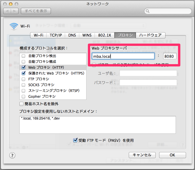 設定ファイルを修正し起動したらプロキシ設定をOSXの設定から行います。一つ注意が必要で、「Webプロキシサーバー」に127.0.0.1やlocalhostなどを指定すると、Squidからは接続元のIPアドレスがローカルホストになってしまうため判別できませんので、「コンピュータ名.local」を指定します。「保護されたWebプロキシ」にも同じ設定をしましょう。